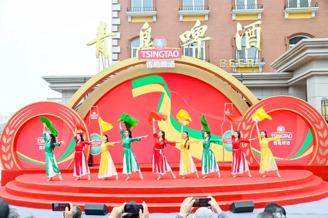 以青岛啤酒120周年华诞纪念标识红、绿、金三种主题色为元素的舞蹈《万疆》开启了发布活动。