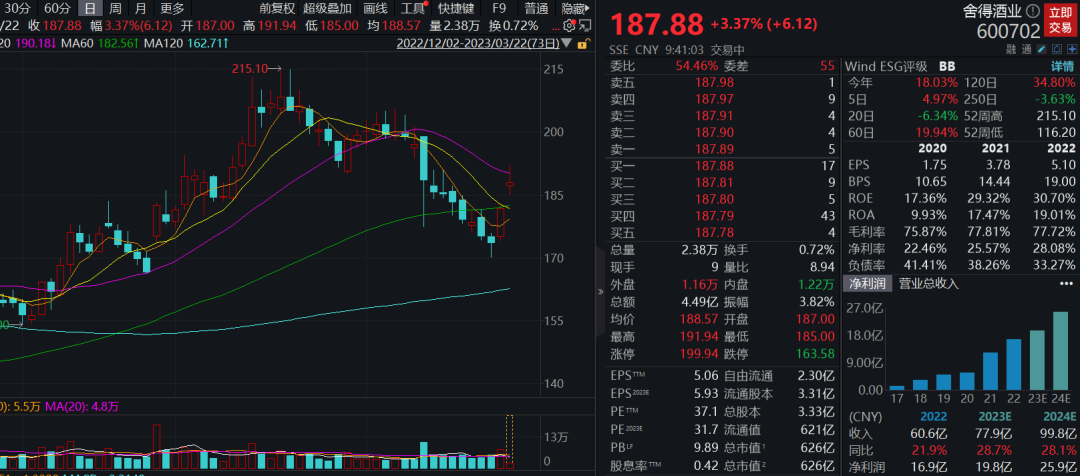 3月22日,舍得酒业开盘走高,截至发稿,涨超3%,报187.88元,成交额超4亿元。