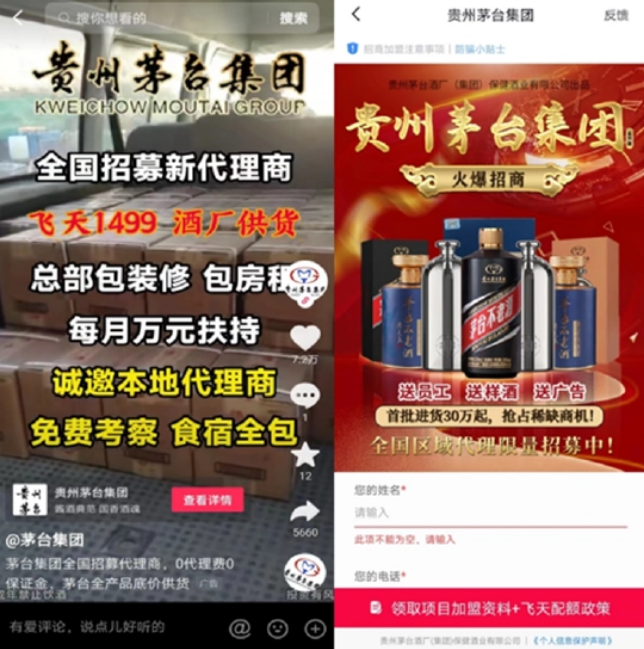 目前茅台保健酒还在大力度招商,其招商广告已经出现在了抖音平台,与习酒“同台竞技”,根据宣传资料,为了招募代理商,公司甚至打出提供飞天茅台配额的广告语。