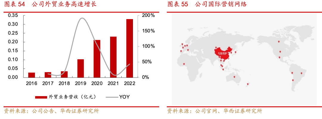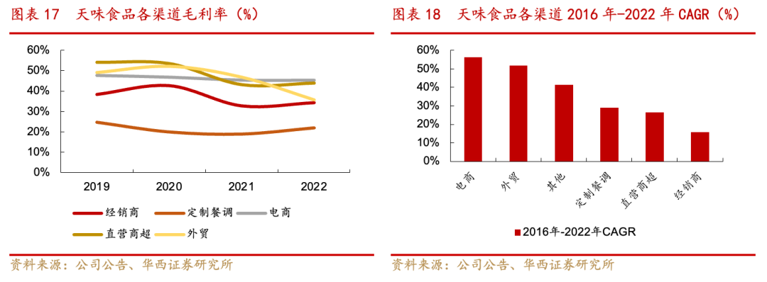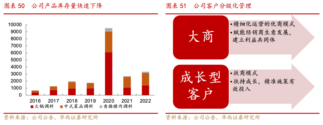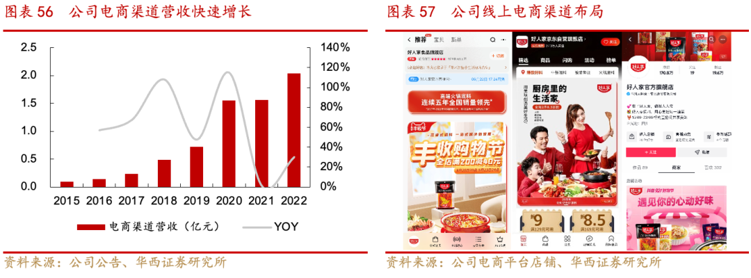 公司渠道管理全面优化,进一步提升效率和粘性。经销商端公司调整旗下3000多家经销商管理制度,通过优商和扶商的分级运营模式赋能经销商,实现渠道库存优化,并推动经销商销售规模快速提升。定制餐调渠道模式优化为餐饮定制+餐饮应用解决方案,服务几万家餐饮连锁单店,大客户包括张亮麻辣烫、味千拉面、盛香亭等。电商渠道规模小但快速增长,是收入的重要补充。海外业务占比较小,但通过公司海外GDR发行,有望拓展海外销售渠道,实现复调产业出海。