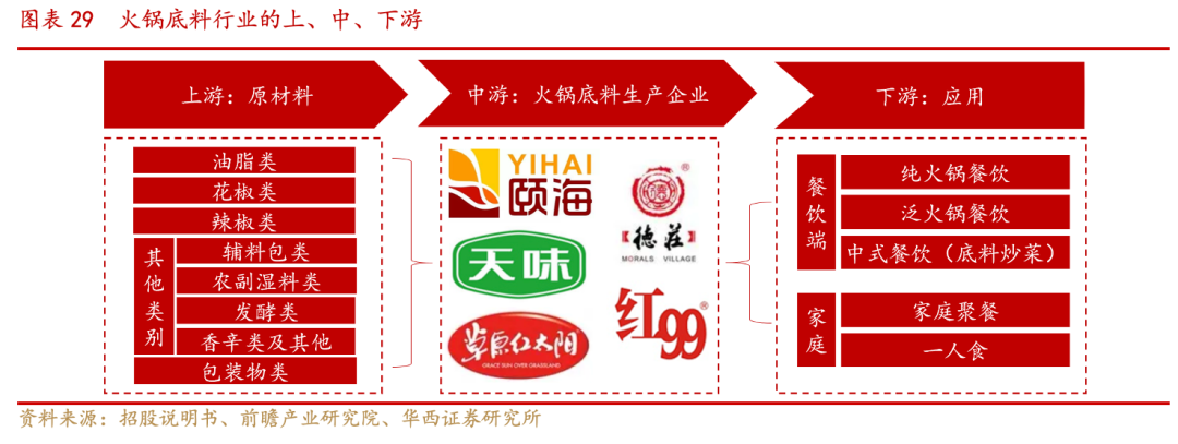 火锅底料行业上游集中度高,中游品牌效应明显,下游应用广泛。就火锅底料产业链整体而言,上游牛油生产商集中度高。牛油主要来自牛屠宰后附着在两边的牛肚油,供给极大程度上取决于牛肉的需求量,且根据海关总署规定,我国禁止从部分国家进口牛油,因此供给不够稳定,牛油供应的波动也影响中游制造企业的盈利能力。行业中游品牌效应集中,主要企业包括颐海国际、红99、天味和红太阳等。下游以餐饮端为主,占比超七成,主要原因是火锅餐饮口味易标准化,开店门槛低,属于易复制的经营模式,容易形成快速扩张,倒逼需求提升。除火锅外,火锅底料还向炒菜、麻辣香锅、麻辣烫、串串、冒菜、毛血旺等消费场景持续扩容。