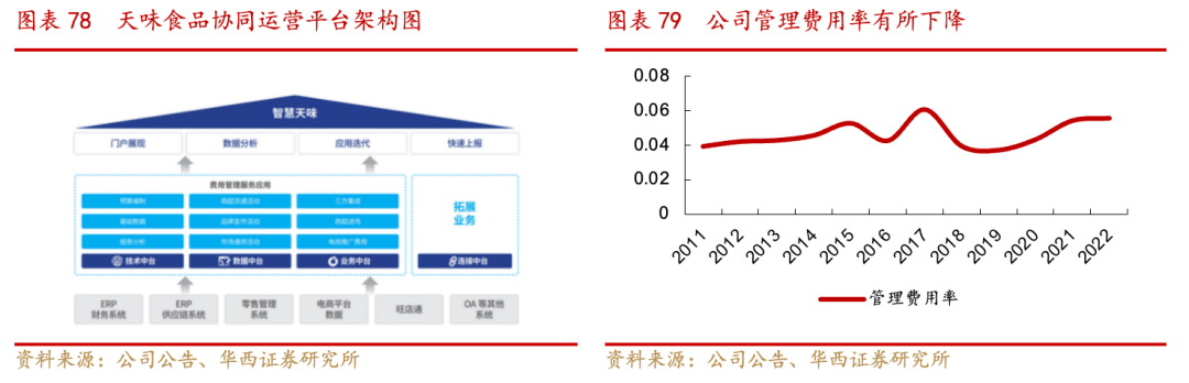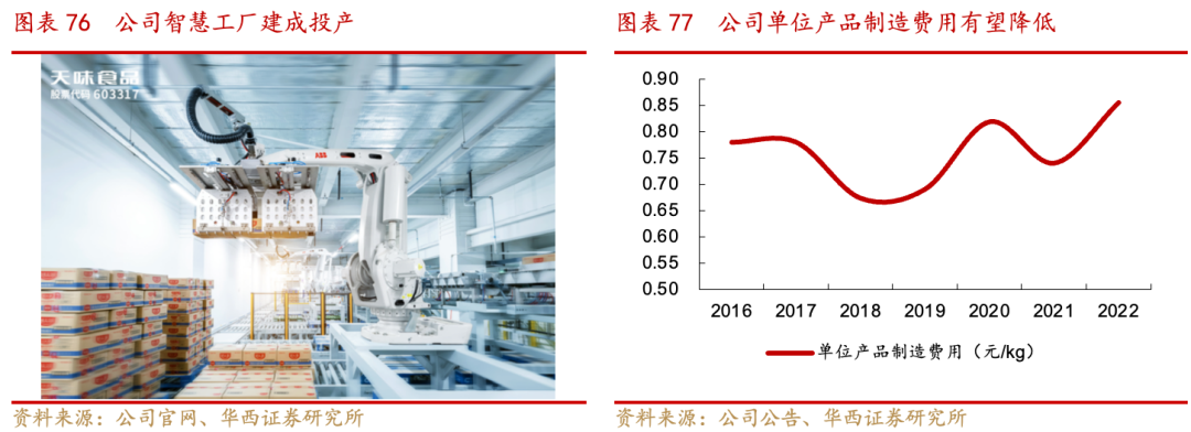 3.2.3.生产精益化、运营数字化,提升供应链、管理效率智慧工厂投产,提升效能。公司智慧工厂在2022年5月顺利投产,一方面提升产能及人均效能;另一方面,能实现了智能化系统布局。在全流程自动化制造和100%数字化管控的基础上,从根本上解决了食品安全、产品品质、风味稳定等行业痛点。“智慧工厂”全球首发,整合多家全国性权威媒体、核心合作伙伴等资源,成功举办主题发布会,大力提升天味食品在行业的影响力,公告称全渠道实现过亿次曝光。伴随着智慧工厂投产,公司单位产品制造费用有望进一步降低。