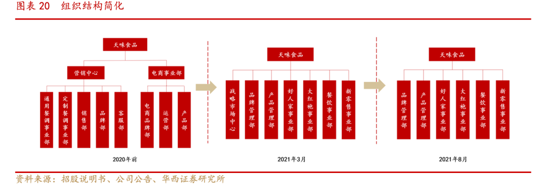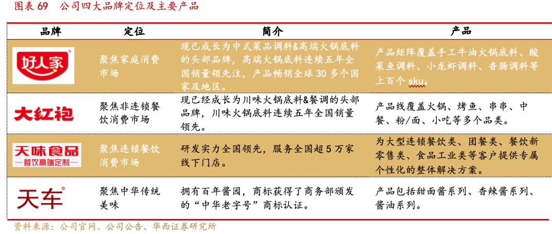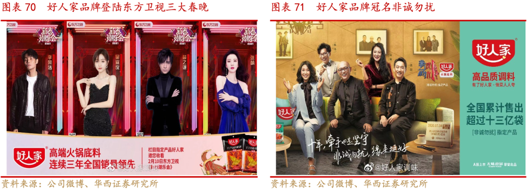 “大红袍”、“好人家”品牌颇具影响力,品牌深入人心。公司作为深耕复合调味料多年的优秀企业,非常重视品牌建设,目前拥有“好人家”、“大红袍”、“天车”、“天味食品餐饮高端定制”四大品牌,在家庭用户、餐饮客户心中树立了广泛的品牌认知和良好的口碑形象,占据了良好的先发优势。公司已成长为中国复合调味品行业的龙头企业,2020年胡润民营企业500强、《2020胡润品牌榜》最具价值调味品品牌两强之一,中国复合调味品品牌第一。品牌重新定位,梳理价格梯度。2019年,公司优化升级“好人家”品牌,加大宣传推广力度。2020年,公司重新定位“好人家”与“大红袍”品牌,“好人家”定位中高端市场,“大红袍”定位为火锅调料大众市场和餐饮小B端市场,为“大红袍”品牌成立了独立的销售组织,并丰富了火锅底料产品线,开发新的大单品,拆分原有经销商并拓展了新的经销商。两大品牌定位清晰,优势互补、同步发力,通过分品牌战略的实施助力实现全国市场的快速布局、保障销量的持续增长。