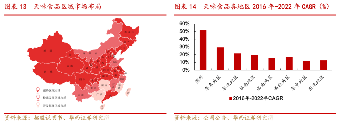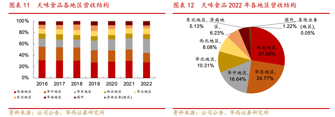 优势区域稳健增长,后发区域潜力巨大。公司实行差异化销售策略,针对不同地区饮食习惯、不同市场竞争状况,结合新产品研发和不同渠道特点,同时推行涵盖服务营销、品牌营销、产品营销、市场推广以及终端促销的综合多层次销售策略。2016-2022年,优势区域西南地区和华中地区的营收复合增长率分别是15.8%、11.4%。华东、华北、华南地区快速发展,五年营收复合增长率分别为29.6%、21.8%和19.5%,营收规模达到6.66、2.77和1.68亿元。
