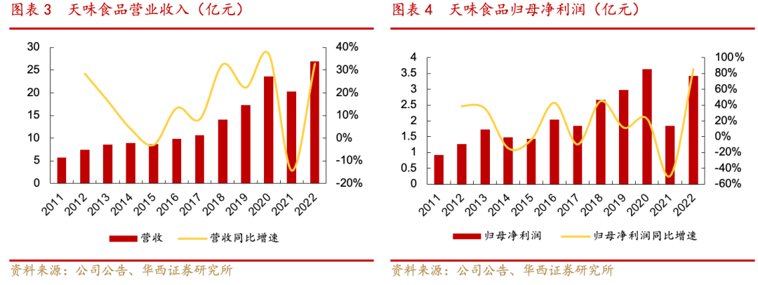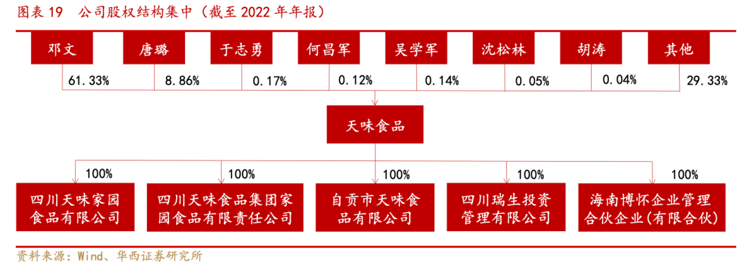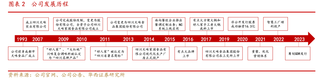 公司前身是1993年成立的成都市天味食品厂,其发展历史大致可以划分为以下三个阶段:2000年-2009年:品牌初创,起步探索。2000年5月,邓文、唐璐夫妇出资成立成都天味。2007年,二人成立四川天味实业有限公司。2009年,公司品牌“好人家”和“大红袍”被认定为“四川名牌产品”。早期公司发展范围集中于川内,稳扎稳打奠定省内优势地位。2010年-2018年:以大单品为发展基石,迅速实现全国化布局。2010年公司完成股份制改制。2010-2018年间,公司持续进行新品研发与产品迭代,相继推出老坛酸菜鱼调料、青花椒鱼调料、四川火锅底料、回锅肉调料、宫保鸡丁调料等产品,其中,老坛酸菜鱼调料迅速放量,成为大单品。借势大单品,公司业绩加速增长,2017年,公司营收突破10亿元,2018年,公司实现营收14.13亿元,建立了覆盖全国的市场营销体系,市场网络覆盖全国31个省、自治区及直辖市,稳固了公司在川味复合调味料市场的优势地位。2019年-2020年:成功上市,借助资本力量快速成长。2019年4月,公司成功上市,2020年11月非公开发行股票融资16.3亿元,募集资金用于扩建生产基地。同年,公司正式提出“好人家”和“大红袍”两大品牌双轮驱动的新战略,将两大品牌定位细化,分别在不同细分市场运营。在此阶段,公司收入规模高速增长,2020年实现营收23.65亿元,同比增速达到历史高位36.90%,利润迅速增长。2021年至今:调整战略,内部转型升级、持续变革。2021年,疫情拖累消费,公司将营销体系进行重塑和优化,强化经营班子,成立营销委员会,下设品牌管理部、产品管理部、好人家事业部、大红袍事业部、餐饮事业部和新零售事业部。2022年公司改革初见成效,实现营收26.91亿元,同比增长32.84%。2023年筹划GDR上市。