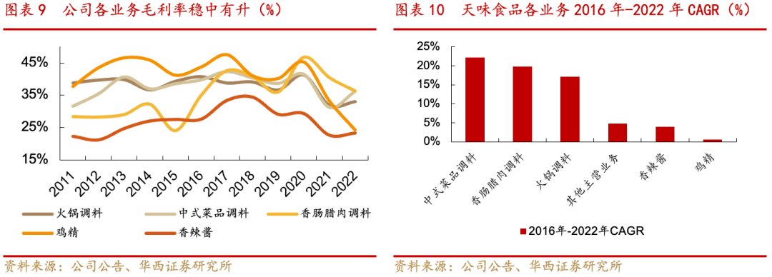 中式调味料、香肠腊味调味料和火锅调料营收高速增长。公司主要业务中式菜品调料和火锅调料维持稳健增长,六年复合增长率分别为22.1%和17.2%。此外,香肠腊肉调料增速亮眼,六年复合增长率达到19.7%,规模达到2.12亿元。火锅调料和中式菜品调料毛利率比较稳定,在公司产品中处于领先水平,香肠腊肉调料和香辣酱毛利率十年中呈现出波动上升趋势。