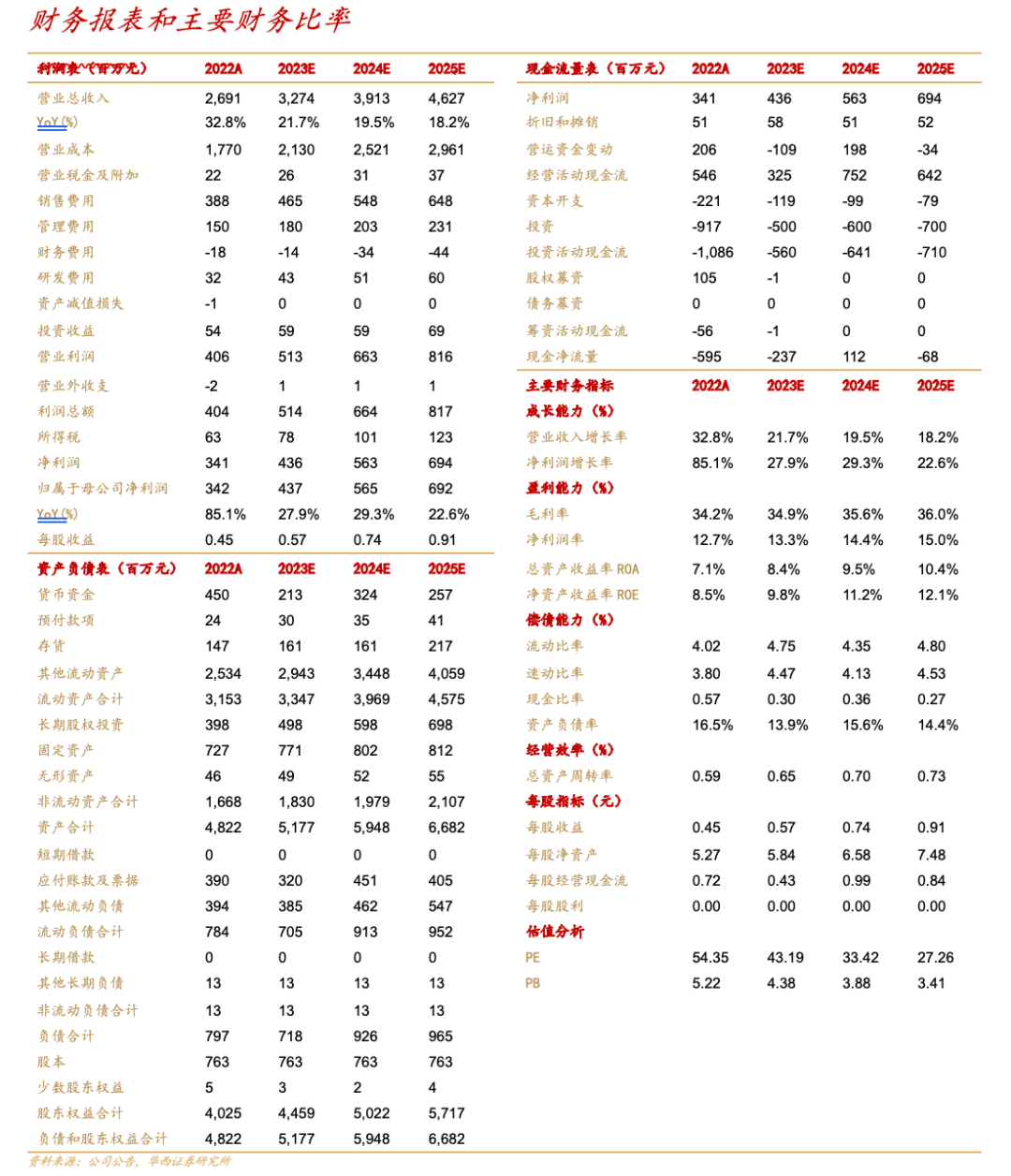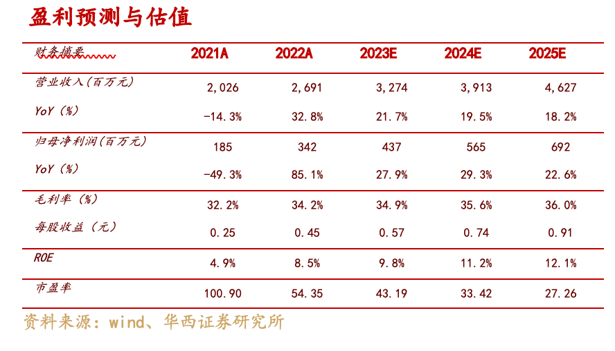 我们预计公司2023-2025年收入分别为32.7/39.1/46.3亿元,分别同比21.7%/19.5%/18.2%;归母净利润分别为4.37/5.65/6.92亿元,分别同比+27.9%/+29.3%/+22.6%;EPS分别为0.57/0.74/0.91元,对应2023年3月17日收盘价24.72元PE估值分别为43/33/27倍。首次覆盖,给予买入评级。