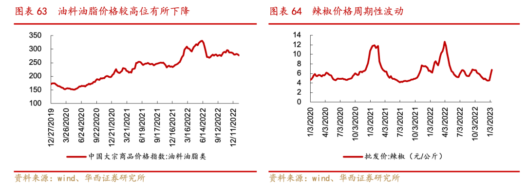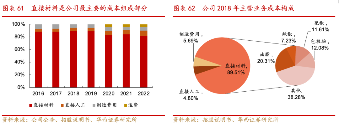 公司利润总额对直接材料的价格变动较为敏感。根据公司招股说明书,假设直接材料价格增加1%,2016-2018年公司利润总额分别变动-2.20%、-2.59%和-2.46%,敏感性系数在各报告期均大于2。由于公司直接材料中原材料品种较多,单一主要材料油脂、辣椒、花椒和包装物的敏感性系数均小于1。近两年,由于原材料价格波动,毛利率由2020年的41.49%下降9.27pct至2021年的32.22%。随着原材料价格下降,2022年毛利率回升至34.22%。后续伴随着成本端压力释放,毛利率有望进一步回升。主要原材料价格缓和。2022年上半年,全球主要的油脂油料价格巨幅波动。5月后,随着印尼棕榈油恢复出口且产量增加,美豆种植预期较好以及全球油菜籽产量预期增加,全球油脂油料价格大幅度下滑,整体由紧张向宽松转变。辣椒价格变动存在一定周期性,整体价格较稳定;花椒价格自2019年来一路走低;2022年来包材价格也有所下调。整体来看,公司成本压力得到缓解,有利于毛利率水平的提升。