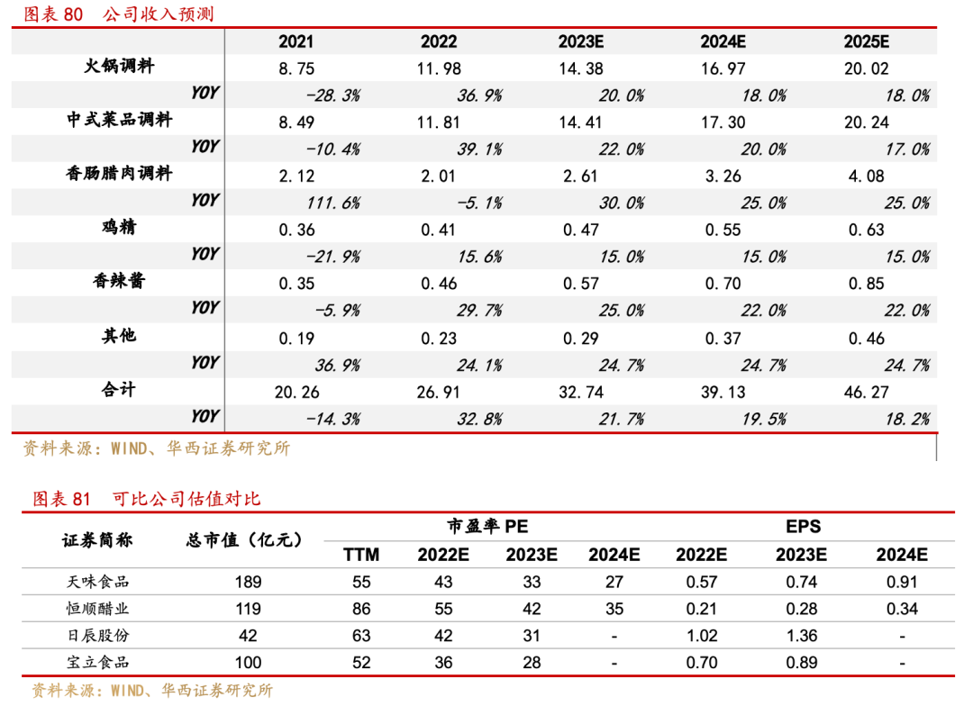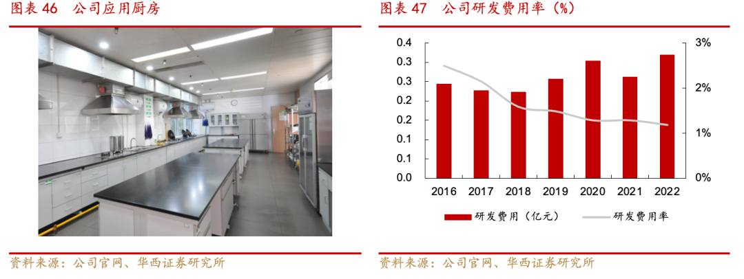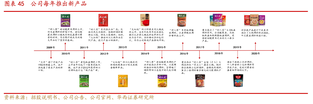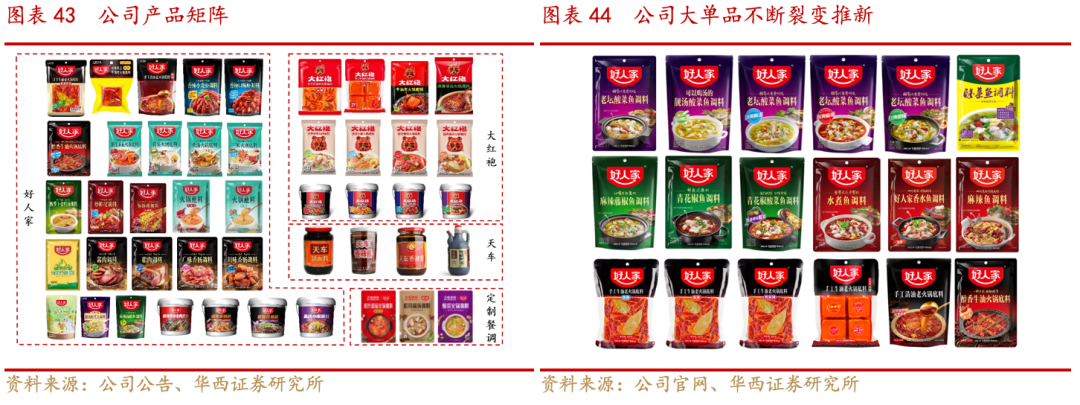 研发水平位居全国前列,多款产品快速增长。公司目前拥有8大专业实验室、3大专业品评团队、12个专业研发小组、13个应用厨房,同时组建了一支80余人的核心研发团队,每年均会推出新产品或新配方,以1-3年为周期,销售一代,开发一代,预研一代,持续打造具有广泛市场需求的大单品。除新品开发外,公司也不断进行现有产品优化和迭代,保持产品竞争力,大单品老坛酸菜鱼调料自2010年推出后,多次进行产品升级,至今仍保持快速增长。此外,其他较受市场欢迎的单品如青花椒鱼调料、小龙虾调料和麻辣香锅调料等也增长迅速。