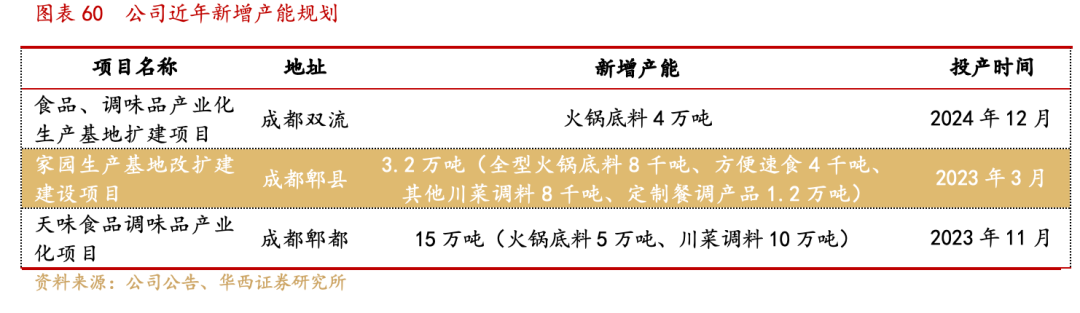 募投项目扩充产能,22.2万吨新增产能将于未来几年逐步投产。2019年4月,公司成功上市,募集资金用于建设家园生产基地改扩建建设项目和双流生产基地改扩建建设项目,项目建成后预计每年新增产能3.8万吨,占2018年公司总产能的42.22%。2020年11月,公司顺利完成非公开发行A股股票的发行,募集资金16.3亿元,用于天味食品调味品产业化项目、食品、调味品产业化生产基地扩建项目,预计新增产能每年19万吨,总产能将达到39.2万吨/年。公司2021年总产能为16.4万吨,未来新增产能总计22.2万吨,为目前产能的135.4%。
