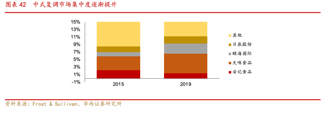 2.3.3.中式复调集中度低,龙头企业有优势持续提升市占率中式复调集中度低,竞争格局仍未成形。中式餐饮菜系林立,川菜发展相对较成熟,广东菜、江浙菜等菜系发展程度低于川菜,每个菜系对应多种品类复合调味料,导致中式复合调味料品类繁多、集中度低。2015年行业CR3仅为8.5%,2019年提升2.7pct至9.8%,其中天味食品、颐海国际、日辰股份分别占比5.2%、2.7%、1.9%。龙头企业市占率将持续提升。随着社会对食品安全日益重视以及国家对企业环保监管力度不断加大,部分规模较小、经营不规范的企业将逐渐被淘汰,优势企业发展将更加迅速,行业整合将进一步加速,企业规模化经营成为行业发展的必然趋势。天味食品专注于川味复合调味料的研发,目前占据中式复合调味料市场份额第一,颐海国际近年也发力中式复合调味料,份额提升较快。龙头企业凭借品牌、研发、渠道、供应链等竞争优势能够持续提升市占率。