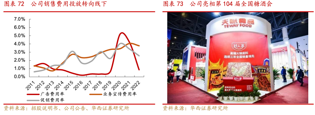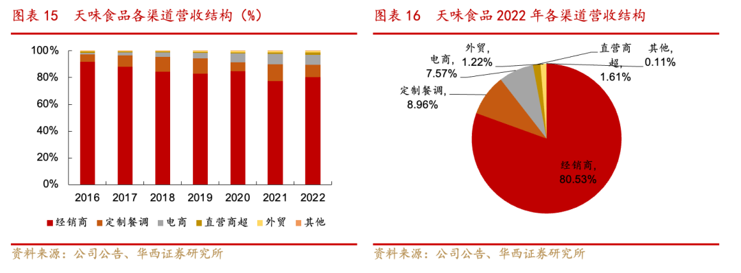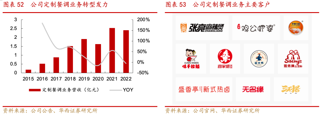 餐饮连锁化成为公司定制餐调业务发展的支撑力量。连锁化是餐饮行业发展的重要趋势,连锁经营可以提效降本,帮助餐企突破管理瓶颈,中国餐饮连锁市场的连锁化率从2019年的13.3%提升至2021年的18%。同时大型连锁餐饮企业对产品标准化、食品安全性及和口味稳定性的需求也推动了复合调味料行业的发展,尤其是对于具有一定口味特色要求的连锁餐饮企业。对于复合调味料行业而言,具有较强的口味还原能力、产品研发能力以及产品标准化能力的头部企业将有较大竞争优势。定制餐调业务实现转型升级,增强服务力。公司还积极拓展经销商渠道以外的其他销售渠道,建设包括定制餐调、电商等多层次的销售网络。2016年起,公司发力定制餐调业务,2019年由纯定制业务模式升级,从纯定制业务模式转向为标品大单品销售+头部客户定制,从单一业务销售型定制模式转向为餐饮定制+餐饮应用解决方案,对重点客户产品横向拓展、产品升级、定制业态拓展,增强客户粘性。目前公司定制餐调业务营收接近2.5亿元,提供火锅、快餐、中餐、特色菜四个系列的定制服务,服务了超过几万家餐饮连锁单店,大客户包括张亮麻辣烫、味千拉面、盛香亭等。