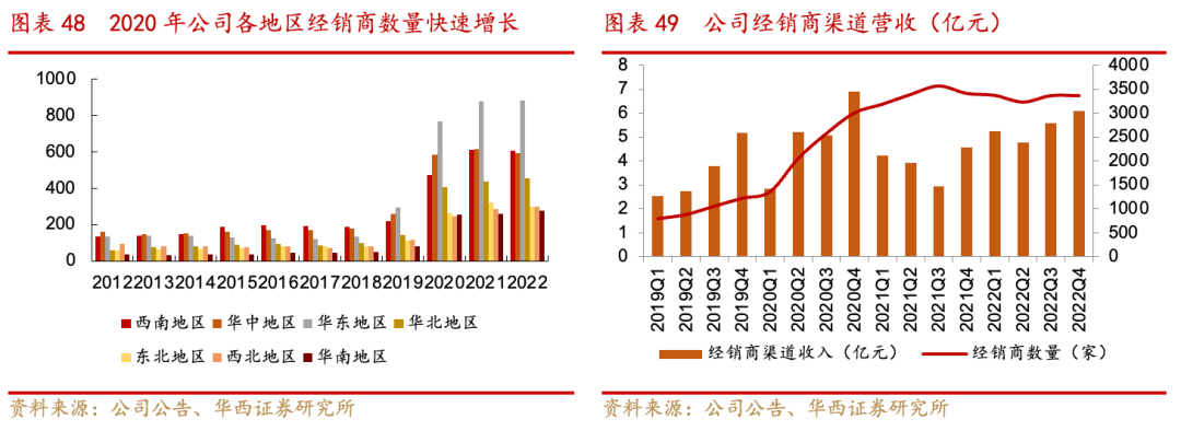 西南、华中地区领军,基本实现全国化布局。公司长期深耕西南、华中地区,两地营收占比50%。2016-2022年,西南地区营收从3.0亿元提升至7.42亿元,占比稳定在30%左右;华中地区营收由2.3亿元增长到4.5亿元,占比在20%上下波动。另外,公司在华东、西北、华北、东北、华南地区也有布局,渠道网络已覆盖全国32个省、自治区及直辖市,形成了四川、河南、东北三省、江苏、陕西、甘肃、新疆、天津、北京、上海等多个优势省市以及由浙江、江西、云南等组成的快速增长区域,已经基本实现全国化覆盖。