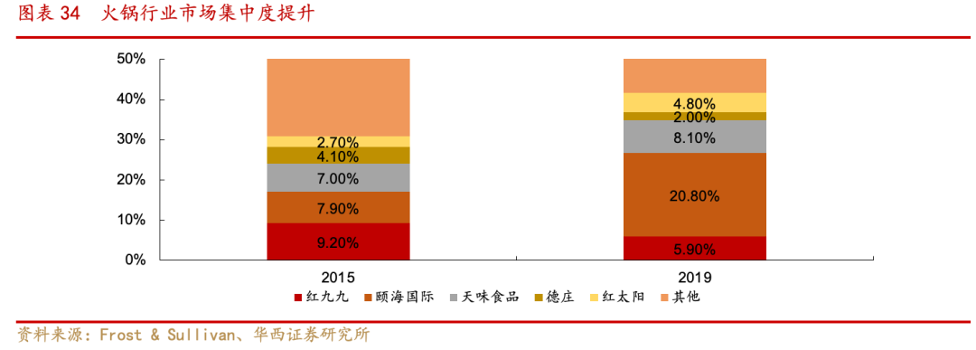 2.2.3.市场集中度提升空间大,中高端火锅底料竞争格局相对集中行业集中度在提升,头部企业份额有望进一步扩大。中国火锅底料行业竞争格局较为分散,行业仅有颐海国际、天味食品等少数企业上市,大部分企业规模较小。2015年火锅底料行业CR5为30.9%,其中红九九、颐海、天味、德庄、红太阳市占率分别为9.20%、7.90%、7.00%、4.10%、2.70%。2019年行业CR5提升至41.6%,除前三大行业参与者以外,其他火锅底料生产商市场份额均在5%以下。随着餐饮连锁化加速,下游餐饮企业对底料的产品品质、供应稳定性和供应规模等都将提出更严格的要求,未来越来越多的餐饮品牌会倾向于使用大厂的底料及定制产品,集中度提升的空间较大。