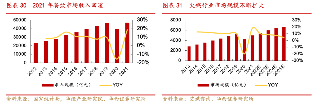 2.2.2.消费复苏,BC端需求的形成为火锅底料增长提供支撑火锅是中国餐饮业第一大菜系,餐饮消费回暖,火锅餐饮消费火热。2021年以来消费回暖,但整体仍不及疫情水平,数据显示,2021年全国人均餐饮消费3320元,同比增速由负转正为18.6%。据《2022中国火锅大数据报告》显示,2021年,全国餐饮业总收入达46895亿元,而火锅的市场规模在中式餐饮中占比达到14.2%,是不折不扣的第一品类。根据艾媒咨询数据,除2020年外,火锅行业的市场规模一直保持增长趋势,2021年中国火锅行业市场规模达到4998亿元,预计2025年将达到6689亿元。