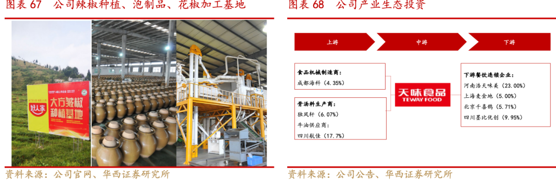 产业链管控模式保障原材料品质。复合调味品所使用的原料大部分为农产品,其特点是标准化程度低、风险高。为保证原料品质稳定,公司对原料种类进行分类管理,建立了8大专属原料生产基地,对核心原料(酸菜、牛油等)、重点原料(豆瓣、辣椒、花椒、泡椒等)采用“农户+合作社+原料加工基地+公司”的产业链管控模式,确保原料从源头收购、到过程加工管理全程可追溯和可控。链接上下游核心资源,实现生态链共同发展。在投资业务上,公司通过横向并购、业投一体、机会型参股投资等形式,先后参股上游食品生产机械制造商成都海科、牛油原料供应商四川航佳、骨汤生产商独风轩和下游餐饮连锁企业河南浩天味美、上海金麦地、北京千喜鹤等公司,通过股权投资链接核心资源,进一步加强公司对上游原料的控制能力,实现行业上下游生态链的共同发展。