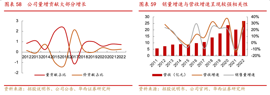 回顾公司经营历史,量贡献大部分增长。拆分近10年的营收,可见除2014年、2017年外,销售量均是营收的主要贡献力量。近五年公司销量对营收的贡献率平均值超过75%。同时,近10年间销售量增速和营收增速呈现出较强的相关性,两者近乎同步增减。