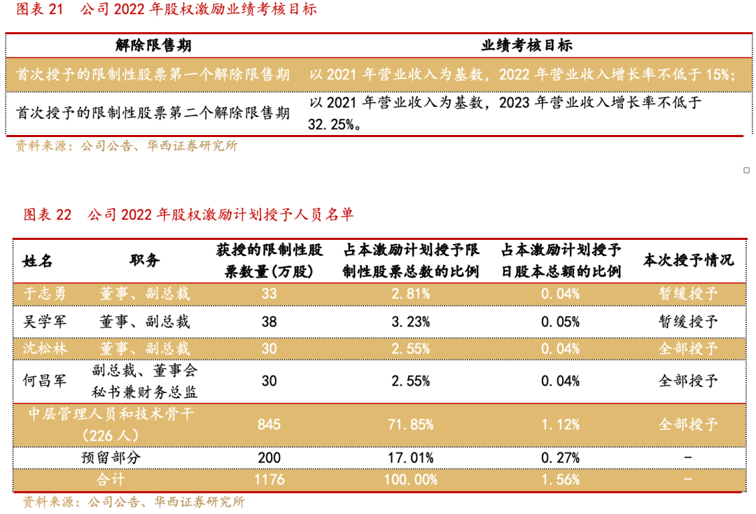多次推出股权激励,增强现任骨干积极性。公司于2020-2021年连续推出激励计划,但受宏观经济影响,销售情况不及预期,公司决定终止激励计划。为了进一步建立、健全公司长效激励机制,吸引和留住优秀人才,充分调动公司管理团队和技术骨干的积极性,2022年2月公司再度推出限制性股票激励计划,涉及董事、高级管理人员、中层管理人员和技术骨干共计237人,考核年度为2022-2023年两个会计年度,业绩考核目标均以2021年营业收入为基数,2022年营业收入增长率不低于15%,2023年营业收入增长率不低于32.25%,并设置个人层面考核要求。