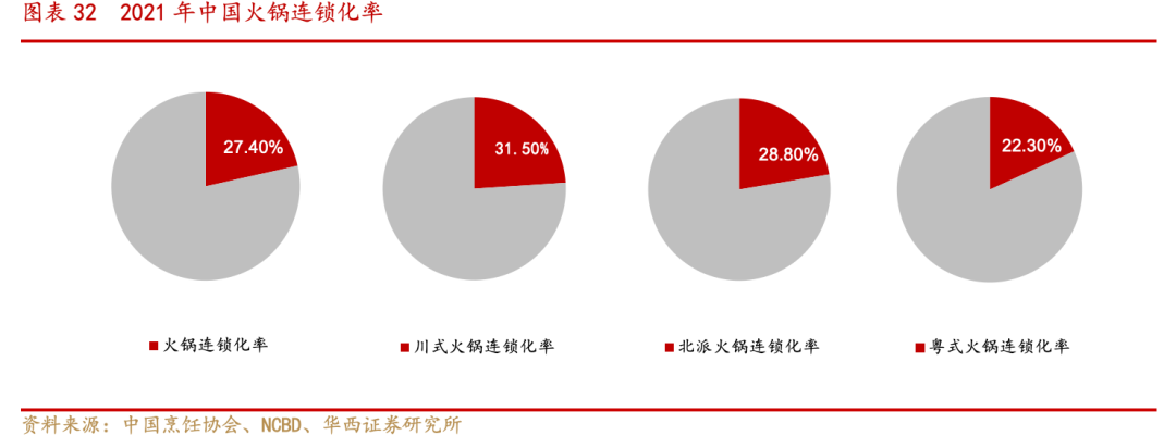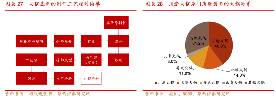 2.2.1.火锅底料主要用于火锅餐饮,消费场景持续扩容火锅底料是以动、植物油脂、辣椒、花椒、食盐、味精、香辛料、豆瓣酱等为主要原料,按一定配方和工艺加工制成的,用于调制火锅汤的调味料,是我国复合调味品行业中重要细分领域,工艺相对简单,以炒拌为主,口味主要由原料品种及配比决定,工艺影响较小。火锅底料主要用于火锅餐饮端,与火锅业态的成长息息相关。同时,火锅底料的用途还延伸至麻辣香锅、麻辣烫等许多菜品制作。六大火锅派系中川渝火锅最受欢迎。结合不同地域的饮食习惯,火锅发展出了六大门派,分别是北派火锅、粤式火锅、云贵火锅、川渝火锅、江浙系火锅和其他类火锅。随着各地口味相互融合,原本饮食清淡的消费者对辣的接受程度逐渐提高,且川渝火锅的辣味具有较强的成瘾性,因此广受消费者喜爱。从门店数量来看,川渝火锅数量最多,门店数占40.0%,北派火锅占14.0%,粤式火锅占比为11.8%。