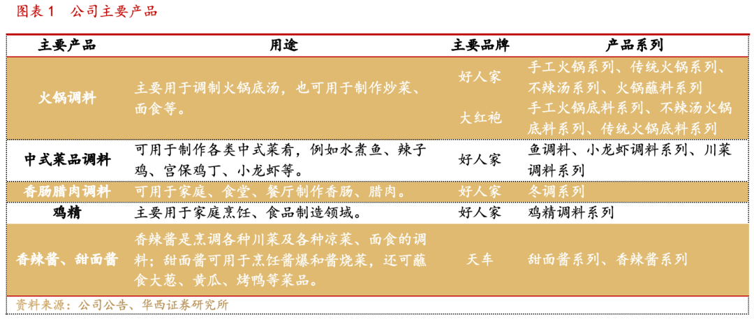 公司专注于川式复调,是中国领先的复合调味品生产商。公司成立于2007年,坐落于四川省成都市双流区,专注于复合调味料的研发、生产和销售,产品包括火锅调料、中式菜品调料、香肠腊肉调料、香辣酱等100多个品种,主要品牌包括“大红袍”、“好人家”及“天车”。公司2019年在A股上市,2022年公司实现收入26.91亿元,成为复合调味料行业的领军企业。