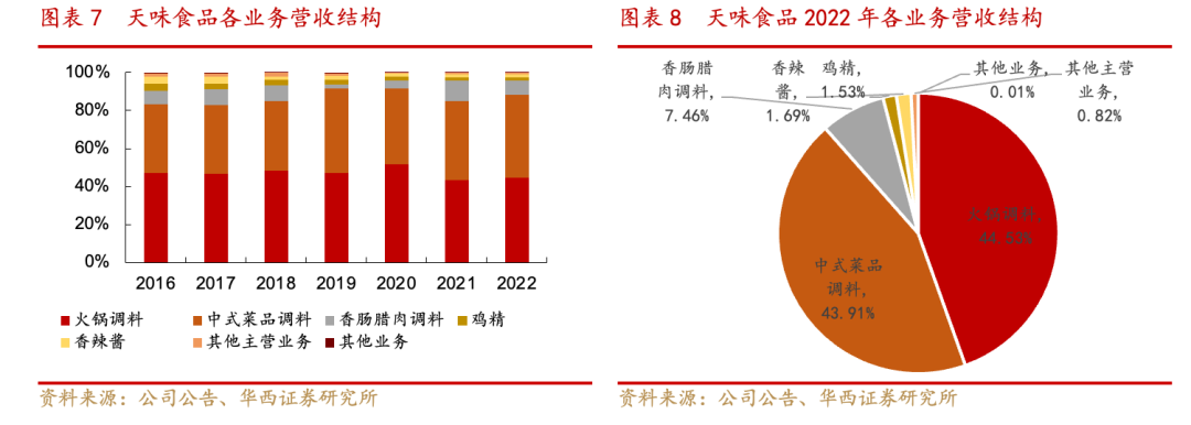 聚焦火锅调料和中式菜品调料业务,其他业务规模稳定。火锅调料产品长期维持公司第一大产品地位,收入规模从2011年的2.1亿元逐年增长至2022年的11.98亿元,营收占比在43%-52%之间浮动。中式菜品调料在2011-2022年间逐渐放量,营收从1.6亿元提升至11.8亿元,占比由31.6%提升到43.9%。香辣酱和鸡精营收规模保持稳定,占比基本稳定,2022年香肠腊肉调料、鸡精、香辣酱产品收入分别占比7.5%、1.7%和1.5%。