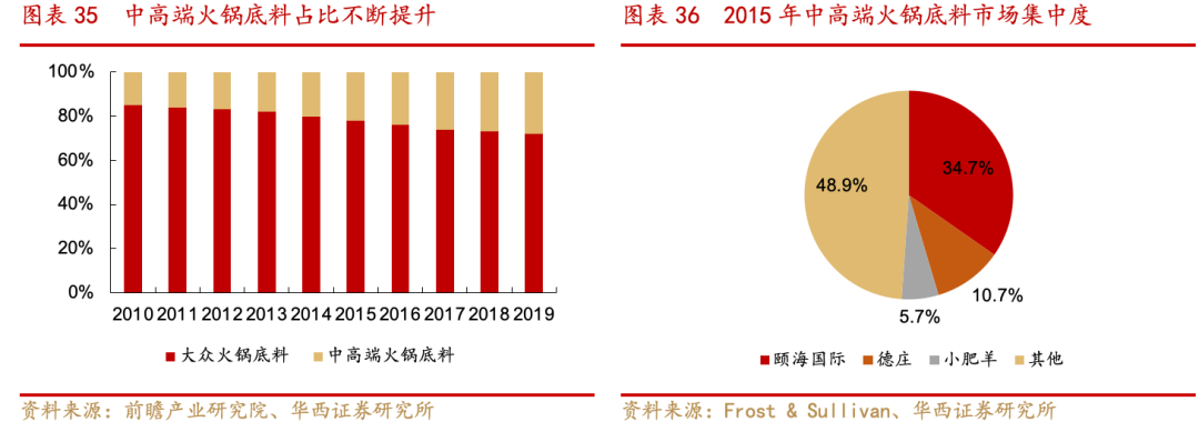 大众火锅底料占据主要份额,中高端火锅底料占比不断提升。火锅底料可以分为中高端火锅底料和大众火锅底料,中高端产品多以植物油为基料,大众产品则以牛油等动物脂肪为基料,大众火锅底料占据主要市场份额。但是近年来,中高端火锅底料因其减油减盐的优点逐渐吞并部分大众火锅底料市场,市场份额由2010年的15%增长至2019年的28%。中高端火锅底料市场占比相对集中,2015年CR3为51.1%。公司品牌“好人家”在2020年重新定位后,专注中高端市场,“大红袍”定位大众市场,同时覆盖头腰部市场,成长空间广阔。