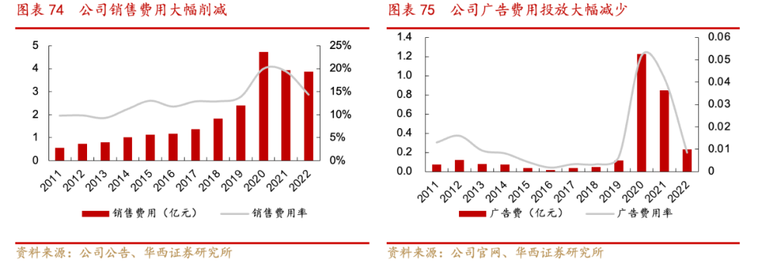 随着外部竞争加剧,费用投放从线上转至线下。2021年行业需求同比增速明显放缓,同时大量跨赛道竞品入局,行业竞争加剧,头部企业均加大品牌及渠道建设投入以抢占市场份额,销售费用进一步上升。2021年,公司调整战略,除牵手周笔畅出任品牌大使外,推出“千城万店”计划,广告投放从线上转到线下。2021年,公司销售费用为3.94亿元,同比减少16.8%。其中,广告费用为0.85亿元,同比降低30.9%。