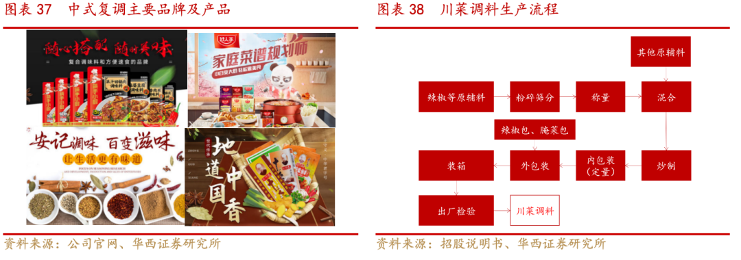 中式复合调味料指具备包装形式、针对中餐研制开发而成的方便型复合调味料。常见的中式复合调料有酸菜鱼调料、鱼露、鱼香肉丝调料、粉蒸肉调料、宫保鸡丁调料、红烧肉调料、京酱肉丝调料、麻婆豆腐调料、炖肉料、十三香等,其中鱼调料包、小龙虾调料包格外火爆。中式复合调味料在生产阶段就完成了厨师在烹饪过程中的调料配比工作,具有便捷性、标准化、口味稳定等优势。以川菜调料为例,整体工艺流程相对简单,主要包括混合、炒制和包装等,加工时间较短,整体行业壁垒较低。