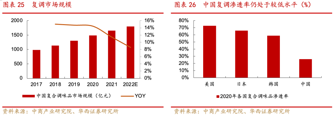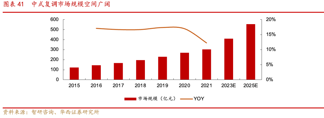 便捷性、标准化、口味稳定推动中式复调快速增长,未来空间广阔。中式复调是整个复合调味品行业中近5年增速最快的细分市场,2016-2021年CAGR高达16.5%。在生活节奏加快的当下,复合调味料可以使年轻的家庭消费者获得方便快捷的烹饪体验,另外餐饮业的规范化、连锁化经营也推动复合调味料需求快速增长。根据智研咨询数据,2021年中国中式复合调味料市场规模达302亿元,同比增长12.27%,预计2025年中国中式复合调味料市场规模将突破556亿元。