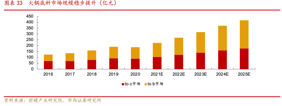 C端家庭火锅消费习惯逐渐养成。C端消费火锅底料占比不到30%,疫情推动了家庭火锅消费习惯的养成,未来占比有望提升。参考前瞻产业研究院调研,有一半的消费者偏好在家里吃火锅,火锅底料有望在C端打开市场。此外,伴随着懒人经济的爆发,消费者为节约时间、追求方便,更多地将火锅底料用于菜肴的烹饪上。根据前瞻产业研究院报告,在B、C两端多重因素驱动下,未来我国火锅底料市场将逐渐打开,预计到2025年市场规模将达到417.5亿元。