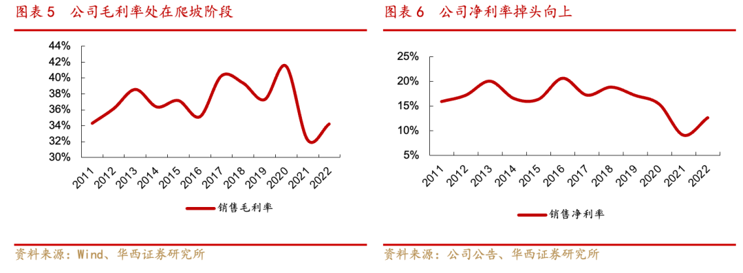 成本压力缓解,毛利率触底回升。公司毛利率变动较为稳定,从2011年的34.22%波动提升至最高点2020年的41.49%,增加7.27pct,期间小幅波动主要受产品结构、产品单位售价和成本变动、销售渠道结构等因素影响。2021年,受疫情、原材料成本高位影响,公司毛利率下滑9.27pct至32.22%。2022年以来,主要原材料价格不同程度地下降,公司成本压力得到缓解,2022年销售毛利率为34.22%。直面问题迅速调整,净利率修复。公司利润率在2011-2016年呈现出缓慢上升的趋势,2016年达到高点20.67%,主要受益于2016年度毛利率提升和期间费用率降低。2017年净利率受到股份支付因素影响同比下降。2018-2021年公司净利率连续下滑,从18.87%下滑9.77pct至近10年间的最低值9.10%,其中2021年主要受公司推进渠道去库存和销售费用投入增加的影响。2022年以来,渠道去库存初见成效,净利率水平有所恢复,销售净利率恢复至12.66%。