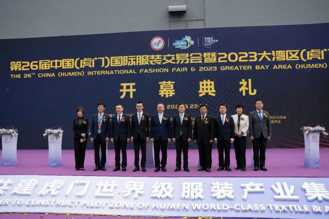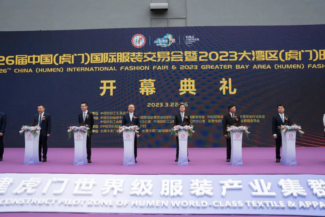 国际纺织制造商联合会主席、中国纺织工业联合会会长孙瑞哲,东莞市委常委、副市长邢文聚,中国纺织工业联合会副会长、中国服装协会会长陈大鹏,东莞市政协原副主席钟淦泉,虎门镇党委书记蒋亚军,虎门镇党委副书记、镇长吴庆球,中国印染行业协会会长陈志华,中国流行色协会会长朱莎,中国纺织信息中心党委书记、中国纺织工业联合会社会责任办公室主任阎岩,中国纺织工程学会理事长伏广伟共同为第26届中国(虎门)国际服装交易会暨2023大湾区(虎门)时装周启动开幕。