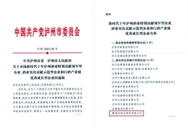 近日,中共泸州市委、泸州市人民政府下发了《关于表扬新时代十年泸州酒业特别贡献领军型企业、酒业突出贡献示范型企业和白酒产业链优秀成长型企业的通报》,白酒投集团旗下醉清风酒业成功入选“新时代十年泸州酒业”突出贡献示范型企业名单。该名单经企业自主申报、专家评审以及公开意见征求等环节,确定最终入围企业。