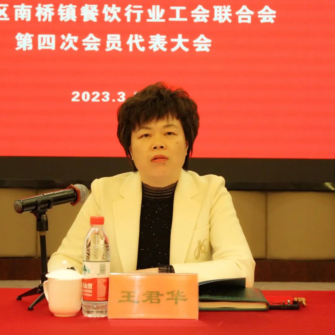 南桥镇人大副主席、总工会主席王君华向大会致辞。希望餐饮行业工会在新一届班子的带领下,继续坚持以职工为中心的工作导向,以改革创新为工作动力,为推动南桥镇餐饮行业高质量发展贡献工会力量。