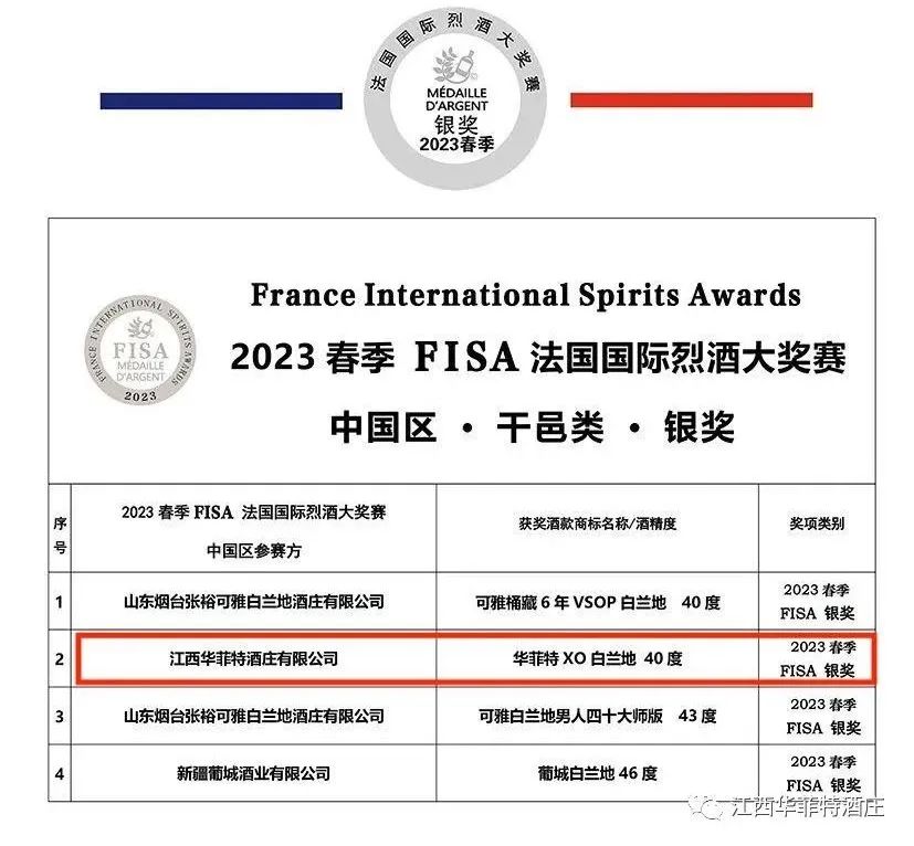 近日,FIWA、 FIWA Bio & FISA 法国国际葡萄酒、法国国际有机葡萄酒及法国国际烈酒三项大奖赛 评奖结果出炉啦!江西华菲特酒庄选送的华菲特·老树龄和华菲特·XO白兰地分别斩获金奖和银奖。这是华菲特酒庄今年斩获的又一项国际上具有影响力的大奖。