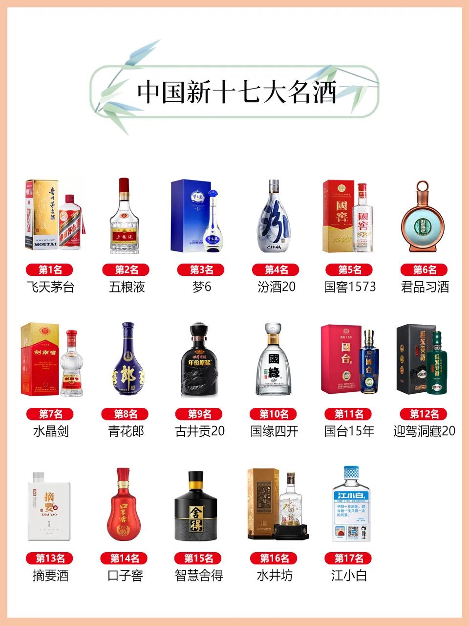 排名依次为茅台酒、汾酒、五粮液、洋河大曲、剑南春、古井贡酒、董酒、西凤酒、泸州老窖特曲、全兴大曲酒、双沟大曲、特制黄鹤楼酒、郎酒、武陵酒、宝丰酒、宋河粮液、沱牌曲酒。