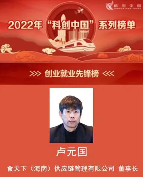 时代呼唤创新,创新大有可为,会议发布2022年“科创中国”系列榜单。遴选出先导技术榜150项、新锐企业榜100项、融通创新组织榜10项、创业就业先锋榜50项、技术经理人先锋榜20项、国际创新合作50项、开源创新榜30项。其中,食天下(海南)供应链管理有限公司董事长卢元国入选“科创中国-创业就业先锋”。此榜单聚焦热点领域或关键核心技术领域突破,具备高成长性的科创型企业优秀创业者,以此激励更多的青年人积极进取、勇于创业,在新时代新征程中砥砺奋进、建功立业。