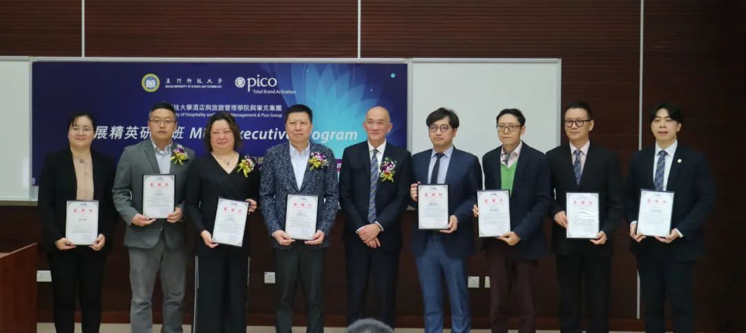 出席的嘉賓包括:澳門展貿協會陳思雅理事長、澳門會展旅遊協會何海明會長、筆克集團大中華區總裁顧耀忠先生、筆克集團華南區執行董事呂玉女士、聯通沃橙CEO姜浩先生、筆克集團企業人力資源發展總監金志穎女士,澳門科技大學酒店與旅遊管理學院吳國民院長、產教融合事務拓展辦公室顧問吳曉寧先生以及酒旅學院教師。開幕式上,吳國民院長、陳思雅理事長、何海明會長、顧耀忠先生、呂玉女士、姜浩先生以及吳曉寧先生一起為開課進行了儀式剪綵。吳國民院長在致辭中表示,非常榮幸能與筆克集團合作舉辦「會展精英研習班」。在過去的二十三年裡,澳門科技大學取得了卓越的進步,酒旅學院的各個學科均獲得TedQual教育組織認證。學院致力於推動澳門旅遊及酒店業的發展,同時增進與業界及學術機構合作,共同培養及發展酒店業人才,為澳門的社會和經濟發展做出進一步貢獻。希望未來不斷增進澳科大酒旅學院與筆克集團的交流與合作,一起攜手共進,邁向新征程。顧耀忠先生代表筆克集團向澳門科技大學23周年校慶表示熱烈祝賀。同時希望通過結合筆克50餘年會展行業實戰經驗與澳門科技大學酒店與旅遊管理學院豐富的會展行業研究成果,為中國會展行業培養與時俱進的專業人才,賦能中國會展行業,助力中國經濟快速發展。最後,吳國民院長為「會展精英研習班」全體授課老師頒發感謝狀。(左起:徐曄助理教授、姜浩先生、陳思雅女士、何海明先生、吳國民院長、黃穎祚副教授、李明助理教授、王碩助理教授、張一航助理教授)開幕式結束後,吳國民院長、陳思雅理事長及何海明會長為「會展精英研習班」開課,參與是次課程的學員主要是來自澳門及內地會展行業中高層管理人員。首日課程結束後,學員們均表示能夠在澳門科技大學近距離聆聽業界專家及學者的課程,意義非凡,收穫滿滿,非常期待研習班之後的課程。希望通過此次研習班,拓展行業思維,加強專業技能,為後疫情時代會展業發展做出貢獻。
