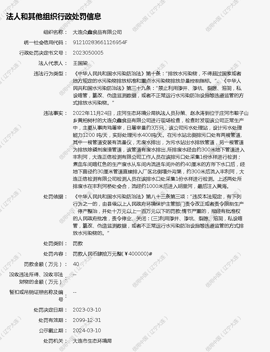 违法事实:2022年11月24日,庄河生态环境分局执法人员孙策、赵永涛到位于庄河市鞍子山乡黄柏树村的大连众鑫食品有限公司进行现场检查,检查时发现该公司正常生产中,主要从事肉鸡屠宰,日屠宰量约3万只,该公司污水处理站,设计污水处理能力1200 吨/天,实际处理污水400吨/天。在污水站北侧排污口处有两根管道,其中一根管道安装有流量仪,无废水排出,为污水站出水排放管道,另一根管道为排放除磷剂废渣管道,该管道有废水排出,所排废水经由约300米地下管道进入丰利河,大连正信检测有限公司工作人员在该排污口处采集1份水样进行检测;煮血车间暗红色的生产废水从车间内流进车间外的约40厘米的方形下水口后,经地下直径约30厘米管道直接排入厂区北侧墙外沟渠,约300米后流入丰利河,大连正信检测有限公司检测人员在该排水口处采集1份水样进行检测。上述两处所排废水在丰利河桥处会合,流经约1000米后进入胡里河,最后注入黄海。