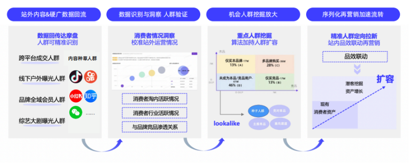 近年来,大众生活消费的主战场渐渐转向线上,作为极具市场潜力、重尝鲜的食品饮料行业,品类之下同场竞技的品牌数量庞大,因此,货品上新是核心。阿里妈妈经过对消费人群需求的洞察后发现,内容种草已成为消费人群决策的重心,食品饮料行业平蓄期全域内容曝光数据将直观影响全周期经营情况。品牌通过站外内容&硬广数据回流,能够借助阿里妈妈达摩盘精准识别被触达过的目标人群;并基于消费人群淘内活跃情况、行业活跃情况及与同类品牌互动关系的分析,校准站外运营策略;进而,依托强大的算法技术对机会人群进行重点挖掘,并精准扩容实现人群前置蓄水;最后,凭借站内序列化追投能力,全方位依托内容种草、站内外联动等品效场景加速人群流转和转化,全力带动生意增长。某巧克力品牌此前一直面临着后链路资产薄弱、流转率较低的难题,借助阿里妈妈诊断分析后锚定“倒土型人群结构”目标,该品牌通过数智种草人群扩容+站内外序列追投+长周期人群蓄水渗透的组合打法,以UD、TOP大曝光、品牌特秀等渠道组合投放,流转率最终提升约12倍、品牌资产整体提升超5倍,实现超预期突破。全域经营时代,“一锤子买卖”经营模式已无法为品牌带来长期生意增长,越来越多品牌关注多节点、多目标的经营质量。人群资产的增长不是一蹴而就的,对于食品行业来说,日销的积累更重要,品牌在日销期要注重人群的锚定、扩容与运营,持之以恒,直至在大促实现量变到质变的爆发。阿里妈妈“平蓄促收”以日销期拉新沉淀、加速货品成长、多元场景精细化投放为核心策略,全方位赋能品牌,提供长周期经营策略,推动生意长效蓄力、实现增长!