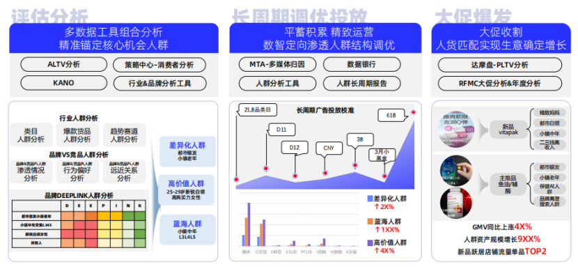 食品饮料行业细分品类赛道拥挤,新消费需求升级迭代,新锐产品日益涌现,平销蓄能、大促爆发是线上营销大势所趋。基于此,食品品牌正在从单一成交的经营思路,转变为重视多维度蓄力,加大在日常经营中的投入,以期平蓄经营及大促爆发的双节奏长周期生意增长。阿里妈妈通过DEEPLINK人群经营方法论全方位分析,帮助品牌精准锚定核心机会人群;借助MTA多渠道归因技术对定向渗透人群结构进行调优,搭建精细化渠道运营策略;运用达摩盘PLTV分析、RFMC大促&年度营销节奏分析工具,以人货实现生意确定增长。阿里妈妈多数据工具组合,以先进的智能算法和因果推断技术,高效解决商家面临的趋势人群运营、全域投放、新品打爆三大经营痛点,助力品牌在平蓄期蓄势待发,在大促获得确定性爆发。
