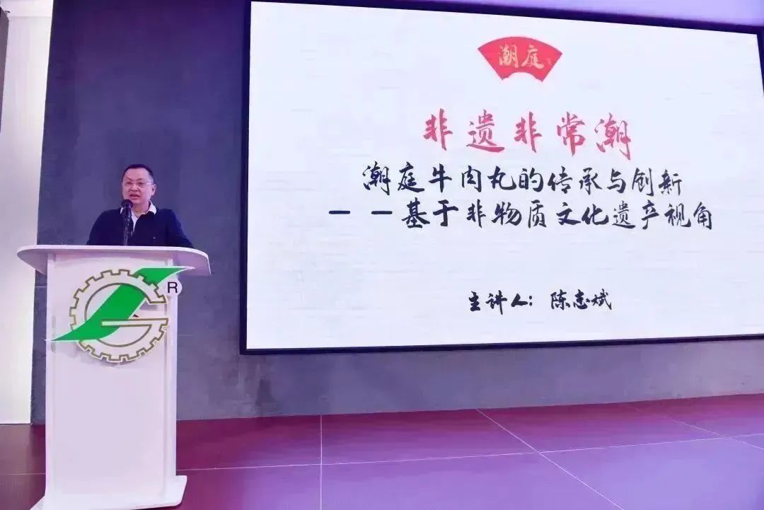 潮庭食品作为协会副会长单位,长期致力于潮汕美食非遗技艺的传承与推广,传承中华传统美食文化,在行业内具有突出的影响力和实力。本次大会,潮庭食品董事长陈志斌应邀出席,结合高质量发展主题,以非物质文化遗产的视角,向与会人员分享“潮庭牛肉丸的传承与创新”。