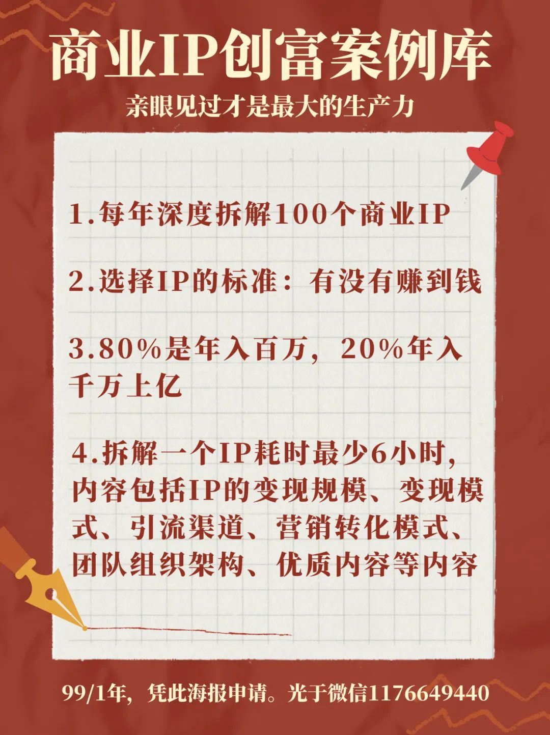 《商业IP创富案例库》,每年从各大互联网平台找出6000个赚到钱的商业IP,其中80%年入百万,20%年入千万上亿,再从6000个商业IP中优中选优,选出100个进行深度拆解。
