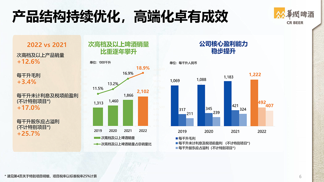 在当天举行的业绩说明会上,华润啤酒再次释放重磅信息,华润啤酒执行董事及首席执行官侯孝海透露,下一步,华润啤酒将持续做强啤酒高端化、持续提升高端啤酒占比,并用三年时间做大非啤“基本盘”。这也让华润啤酒的下一个三年尤其值得期待。