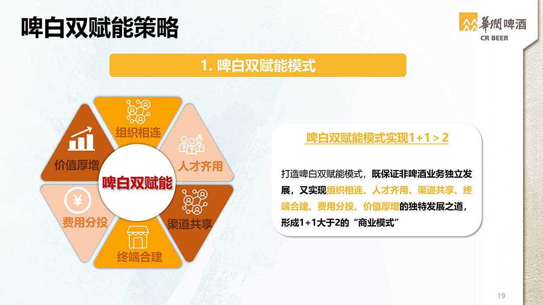 从今年年初华润啤酒对组织架构的重组,也不难看出华润啤酒发展非啤的决心。1月29日,华润啤酒宣布设立华润雪花啤酒和华润酒业两大事业部,前者负责啤酒业务的专业化运营,后者负责非啤酒业务的专业化运营。