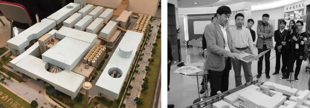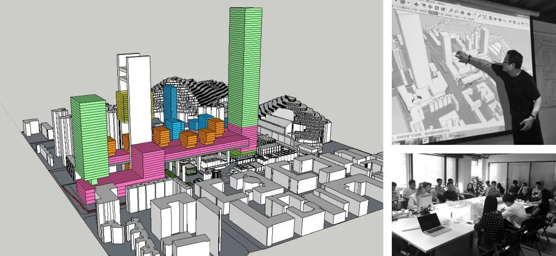 当时工厂建厂时的老模型就摆在工作台的旁边,我们按照所需开发的面积切了体量出来,我说,很简单,就把要开发的面积架在原来的工厂上面不就行了嘛!
