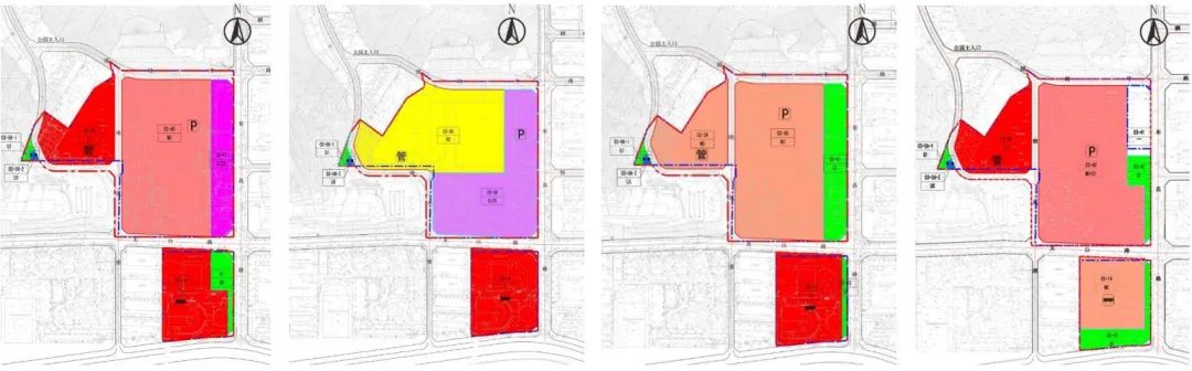 从左至右分别为:2014年11月第二版主推方案,提出划定工业遗产保护用地;2014年11月第二版市场博弈方案,较为极端地提高土地利益以交换历史建筑保护的方案;2014年12月第三版方案,与政府、市场主体协调后调整,以绿地功能进行移交;2015年3月第四版方案,与规委沟通,将发酵罐群等建筑与设备移出拆除范围 © 深规院