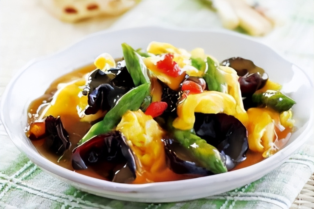 4.锅内再加油适量,倒入葱花爆香,将沥干水的木耳放入,煸炒几下,再放入鸡蛋,加入盐等调味料即可出锅。