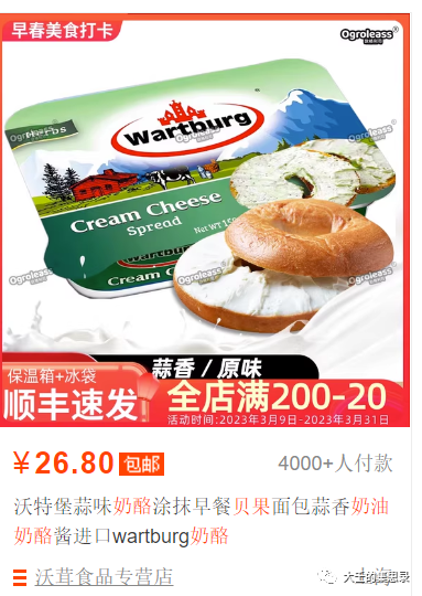 为什么是奶油奶酪,而不是花生酱之类的呢?其实和消费者的心理有一定关系。俗话说好马配好鞍,一个新的小资品类——贝果诞生后,怎么能让它和已经烂大街的花生酱去搭配呢。一定是要用一个同样小众有b格的涂抹类产品搭配!奶酪本身也是中产阶级的消费产物,奶油奶酪作为中间延展度最佳,口感也比较湿润的分支是非常适合作为和贝果搭配的产品的,更何况这种搭配在海外本来就是经典搭配。中产阶级们直接就可以“拿来主义”,其他阶层会竞相模仿中产阶级的做法。