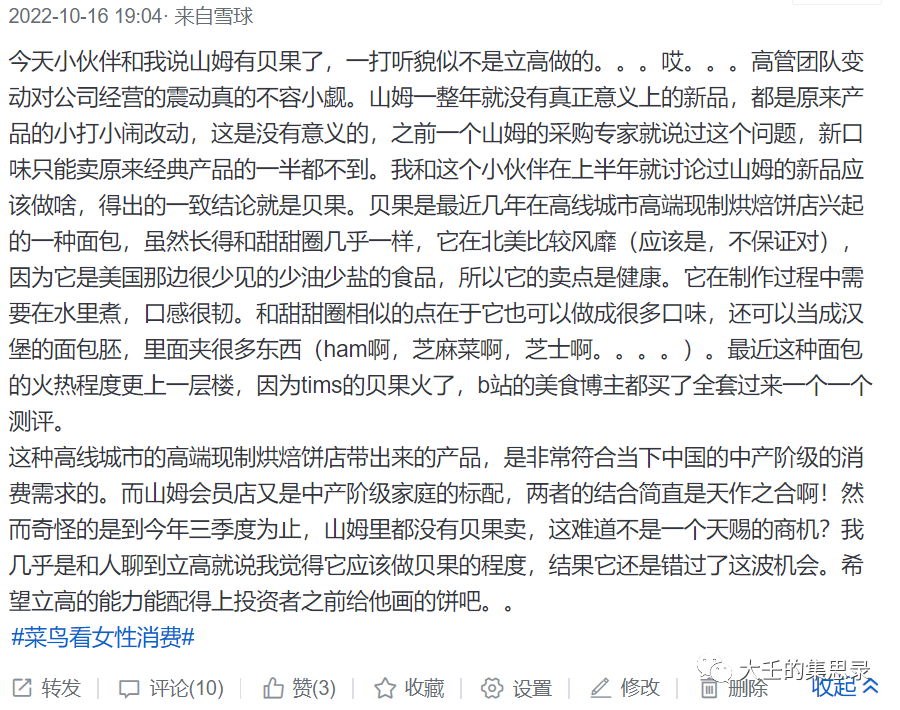 最近南侨食品这家公司被资本市场再次关注到,是以贝果为契机(但是我感觉本质上还是跟着立高一起涨,然后大家找一个理由)。回想自己去年十月在雪球那边写的一个小帖子,感觉自己的趋势判断还是正确的,差不多半年的时间里,贝果火热的趋势越来越明确了。